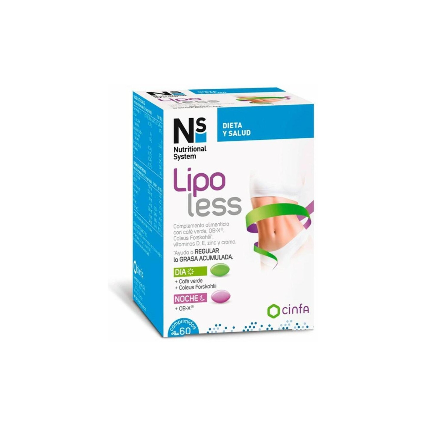 Ns Lipoless en un complemento alimenticio que ayuda a regular el metabolismo de los hidratos de carbono y los ácidos grasos. Está elaborado con una innovadora fórmula que incluye OB-X. Es u a mezcla de extractos de plantas relacionadas como la mora, la melisa y la artemisa. Además, su composición incluye café verde, coleus forskohlii, zinc y activos antioxidantes como la vitamina D y E. Además, la vitamina D contribuye al funcionamiento normal de los músculos, del sistema inmunitario y al mantenimiento de los huesos en condiciones normales. Por su parte, el zinc contribuye al metabolismo normal de los hidratos de carbono, los ácidos grasos y los macronutrientes. Asimismo, ayuda a la síntesis proteínica normal.