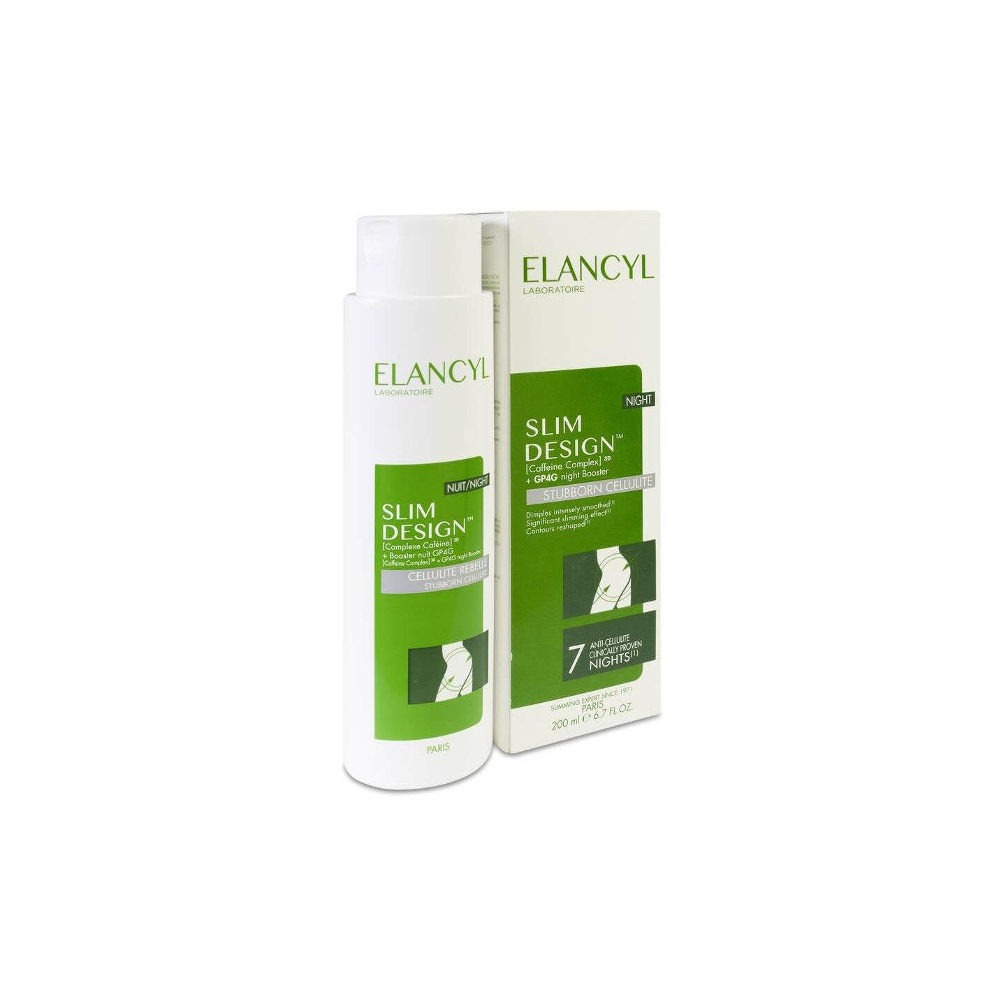 Elancyl Cellu Slim Design Noche contiene activador nocturno GP4G que ayuda a despertar la actividad celular y favorece su eliminación. Contiene también una revolución anti-nódulos con tres acciones que tratan los tres factores principales de la celulitis para conseguir un alisado interno de los nódulos.