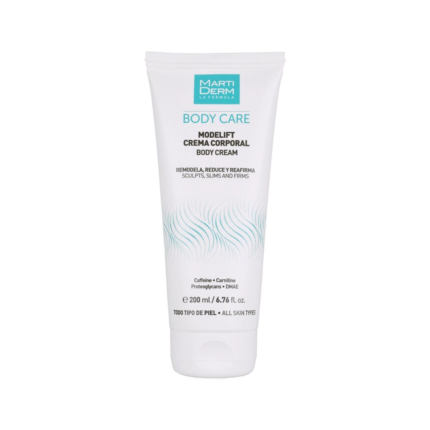 Martiderm® Modelift Crema corporal 200ml es un excelente tratamiento intensivo que actúa remodelando, reafirmando y reduciendo zonas determinadas del cuerpo como: brazos, muslos y abdomen. Su fórmula a base de proteoglicanos y DMAE, que hidratan, mejoran la firmeza y elasticidad de la piel corporal. Además, su contenido rico en cafeína tiene un efecto drenante que, junto a los otros componentes, ayuda a eliminar la grasa acumulada. La crema corporal MartiDerm® Modelift está indicada para el uso en todo tipo de pieles